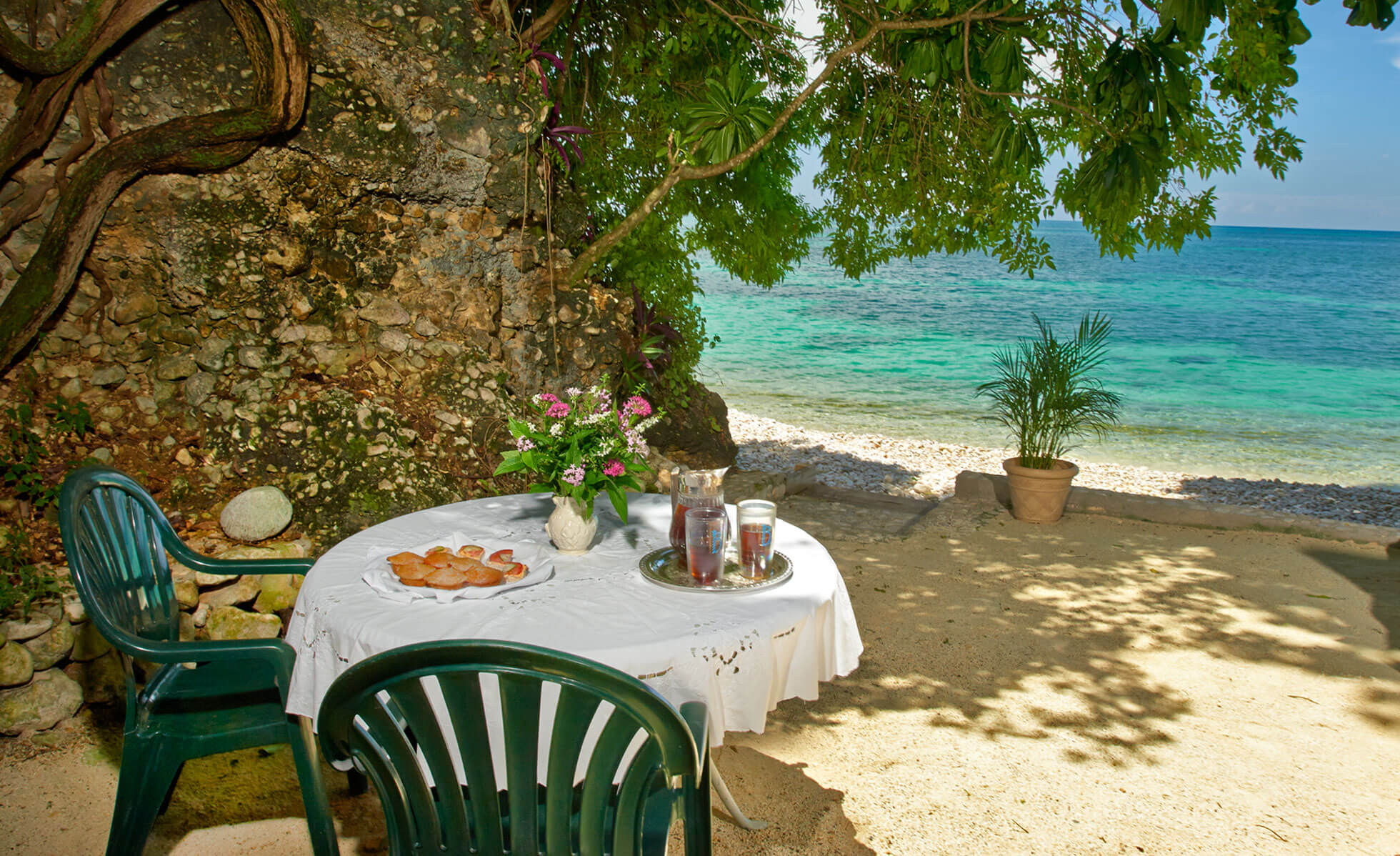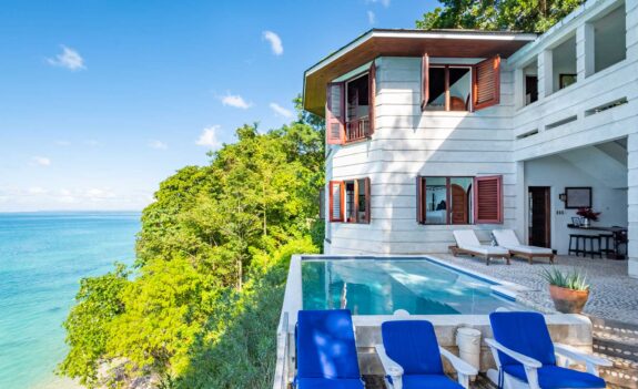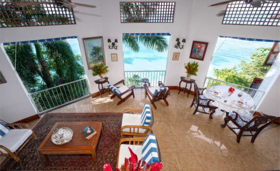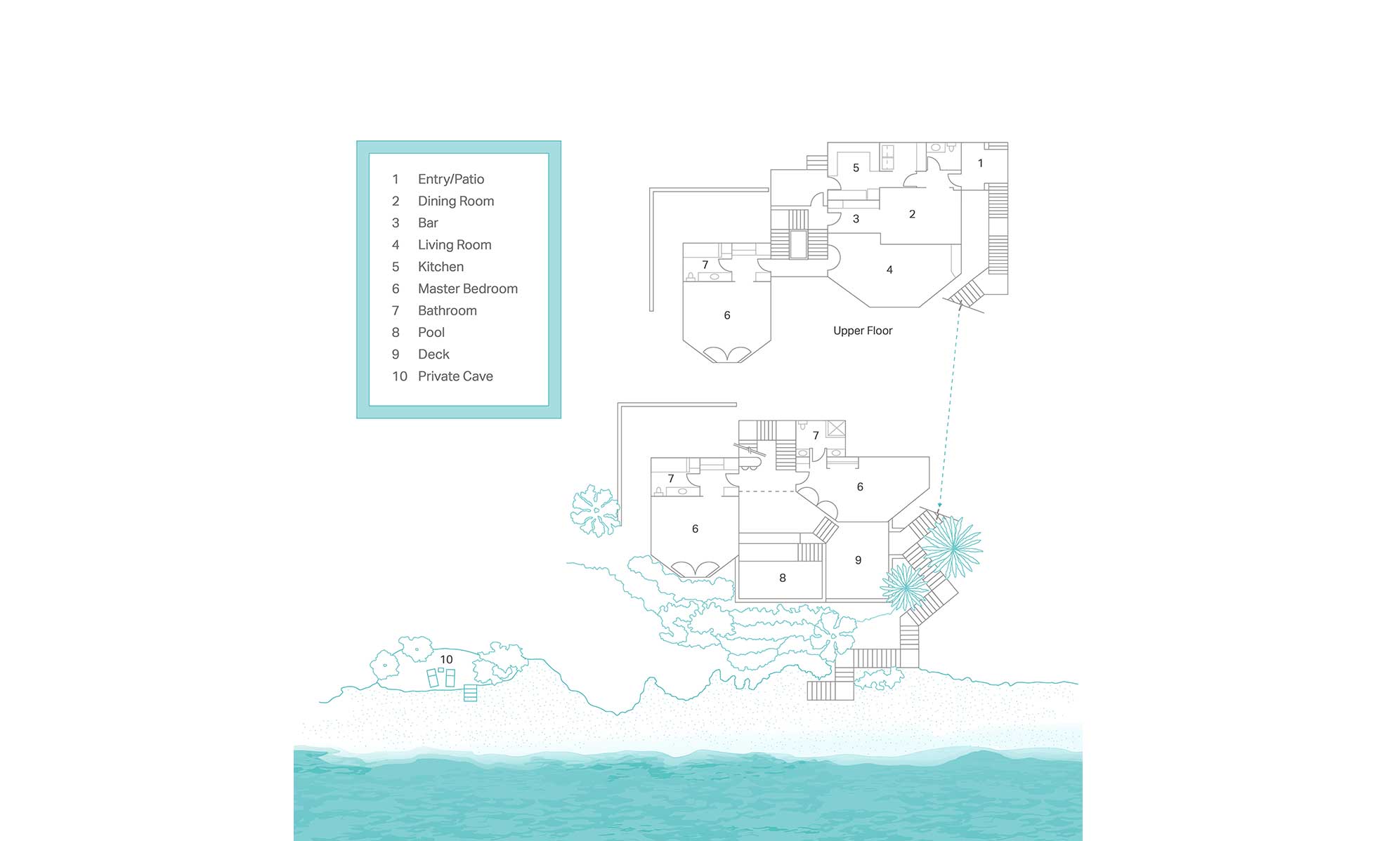Providence House sits on the calmest slice of the Bay. At sea level, 46 steps away, is a cave with hammock, lounge chairs and dining area. The main house features three nearly identical master bedroom suites, a living room, a dining room, an outdoor patio with a bar, and a private swimming pool. Providence House is the most environmentally-friendly villa, as much of its energy needs are filled by solar panels.